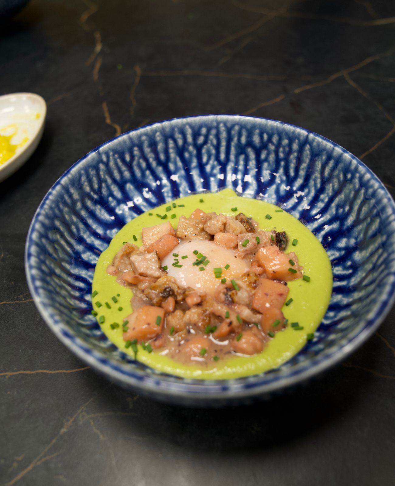 SEPIA CON GUISANTES Y MOLLEJAS. Un magnífico mar y montaña. La sepia cortada en dados y cocinada de forma muy básica, que quede tierna, y las mollejas marcadas en paella a fuego fuerte y cortadas en trozos del tamaño de la sepia, para juntarlo todo, chorrazo de oloroso, y que se conozcan, que intercambien sus jugos. Como base, una crema de guisantes, y como topping, un huevo poché. A cada bocado se escuchaba, «mmmmmmm, què boooo!»