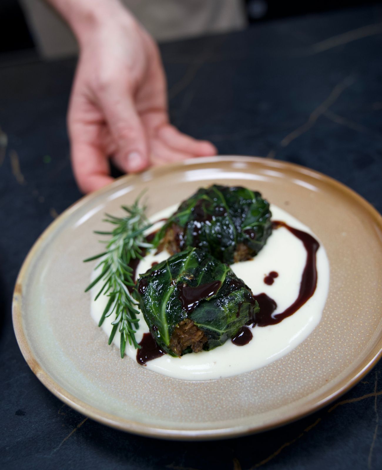 ROLLITOS DE LOMO CON COL. No era lomo, eran carrilleras cocinadas al vino tinto, que desmenuzamos y con las que rellenamos hojas de col escaldadas para hacer un rollito, un canelón o un ravioli. En la base, una sedosa parmentier, y el conjunto regado con una reducción de la salsa de las carrilleras.