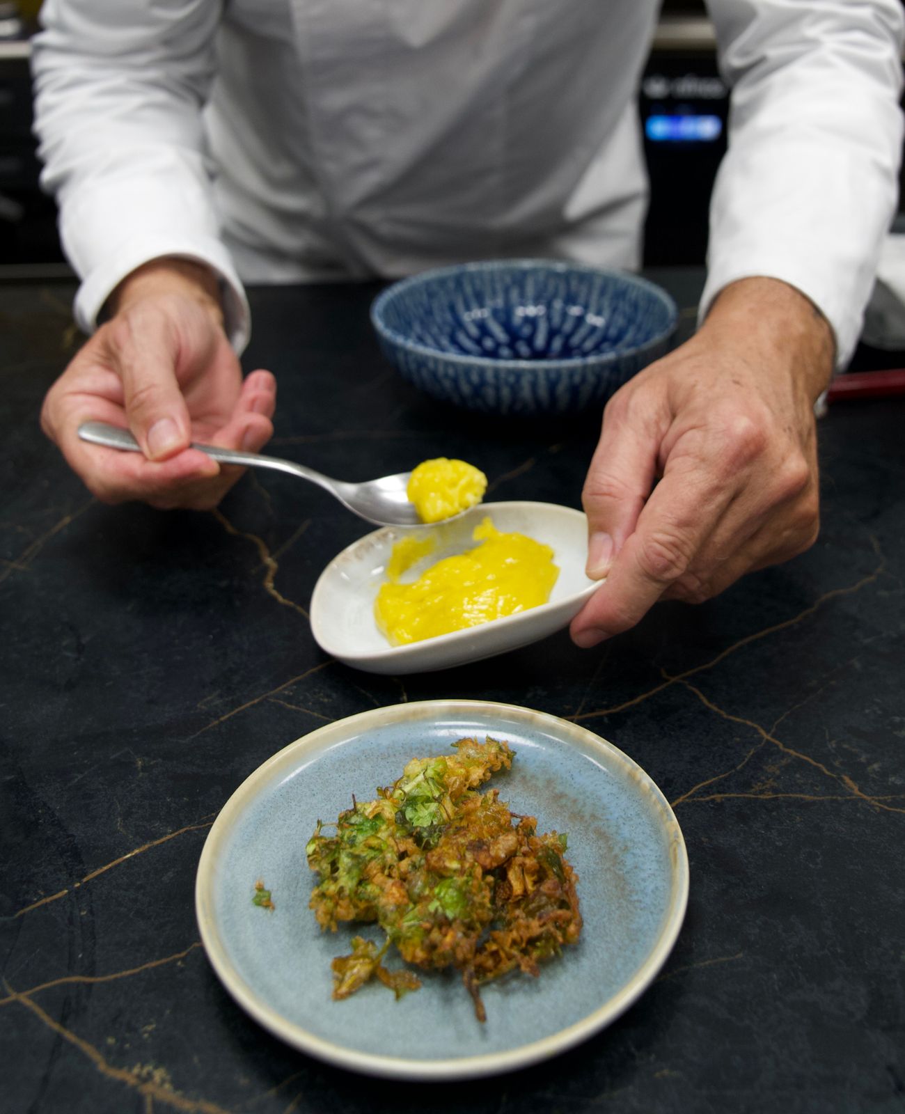 RAOLES D’ENDIVIA Y ALGA WAKAME. Raoles de escarola (en Menorca la llamamos endivia), un bocado popular en las casas de los menorquines (pero no tanto en los restaurantes), al que Pau le quiso dar un poco de punch con el alga, y por encima le pusimos mahonesa hecha en un plato con tenedor.