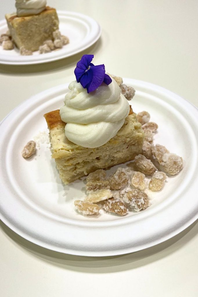 Un postre preparado con brossat (el suero sobrante en la producción del queso) de Menorca y bescuit (una coca bamba tostada) de Formentera, crema de brossat y cacahuetes de Mallorca recubiertos de miel, en forma de garrapiñada.