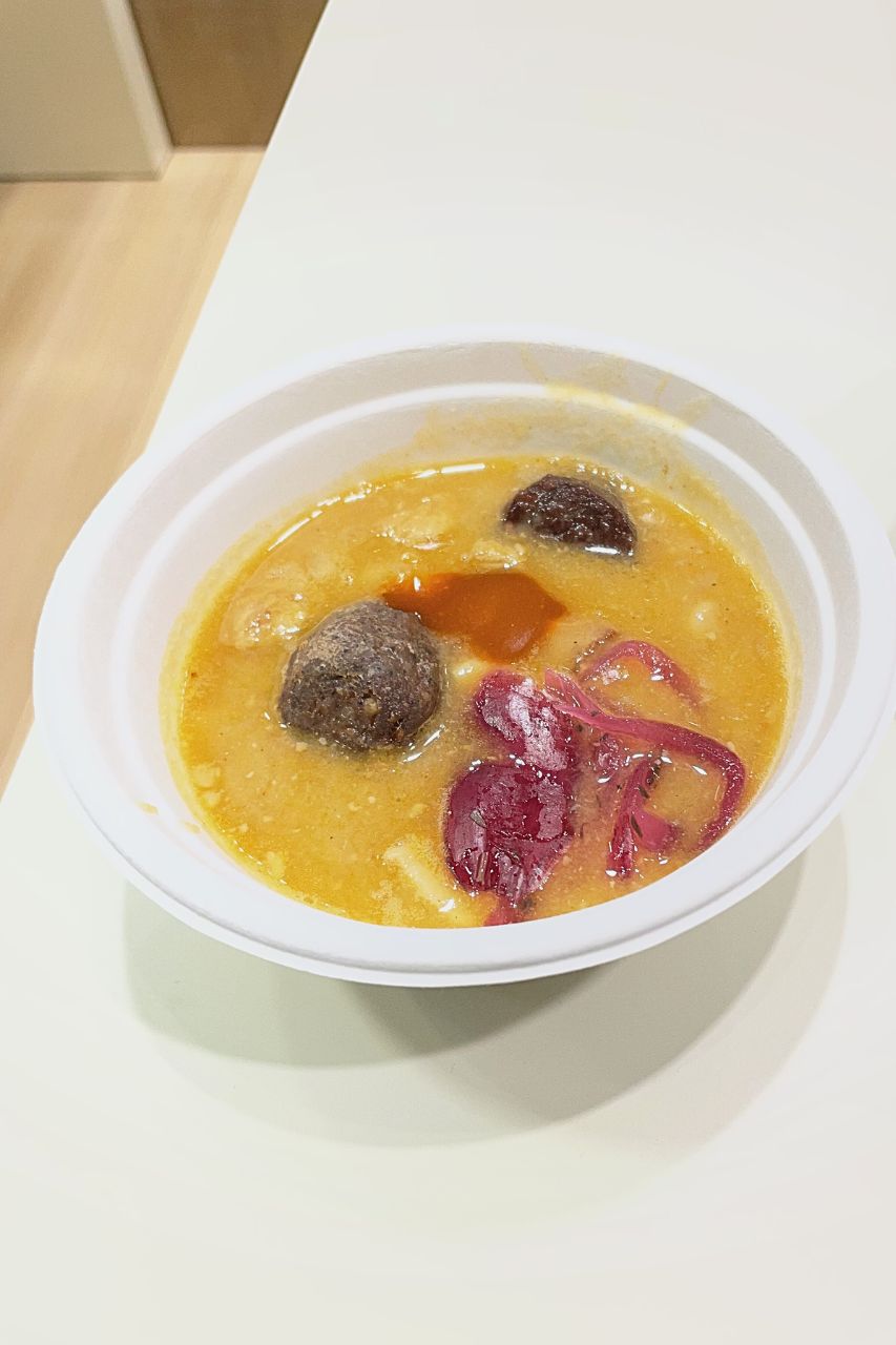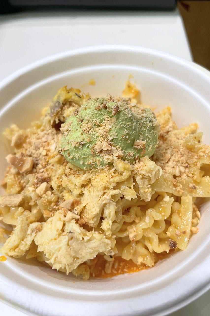 Una interpretación que recordaba a la pasta carbonara, por la emulsión de huevos de Mallorca, crudos y cocinados al calor de la pasta. Las burballes son una pasta de trigo que se comporta como pasta fresca, por lo que necesita muy poca cocción. Sobrassada, pollo de Eivissa, queso de Mahón, y almendras de Mallorca. Todo un descubrimiento.