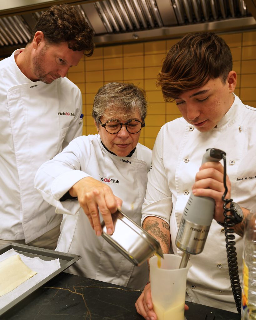 Pero vamos a centrarnos en lo que aprendimos, elaboramos y degustamos los 15 foodies que asistimos a la sesión del pasado miércoles 10 de diciembre. Borrás, acompañado de su inseparable Megan, empezó explicando cómo entiende él la cocina, lo que le inspira, lo que le motiva, y terminó contándonos, en una agradable tertulia después de la cena del grupo, cuál ha sido su evolución en su corta pero intensa trayectoria, y como ha madurado para seguir transitando hacia la excelencia. Entre medias preparamos juntos el menú.