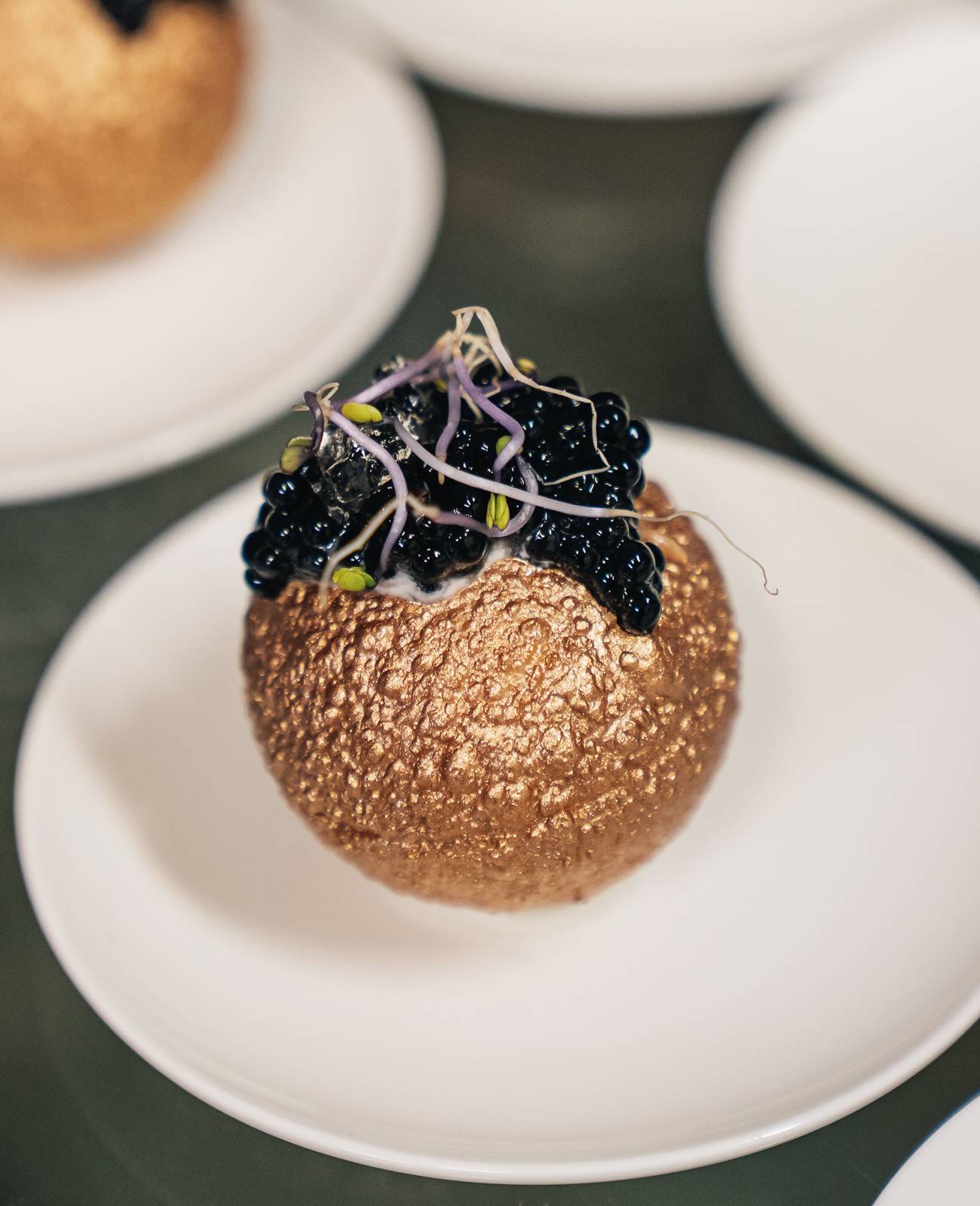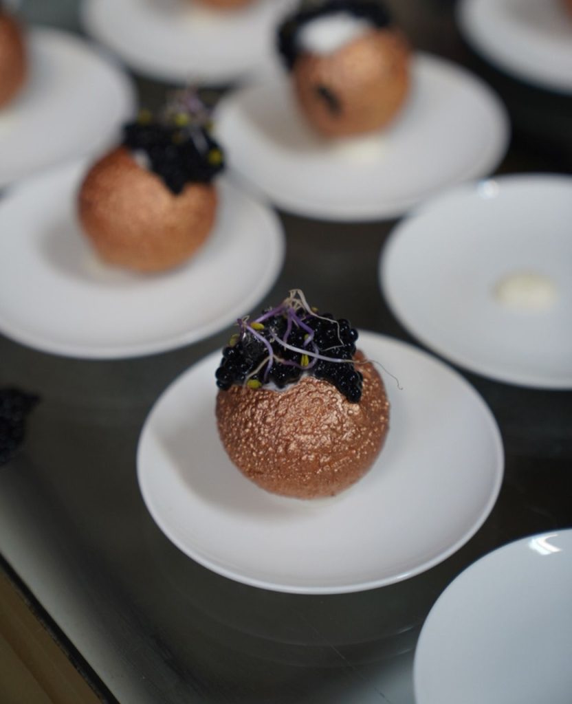 Panipuri bañados en oro, rellenos de crema de queso Mahón madurado, tartar de gamba blanca y gel de champán.