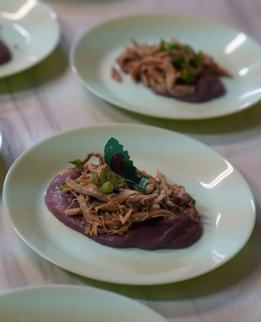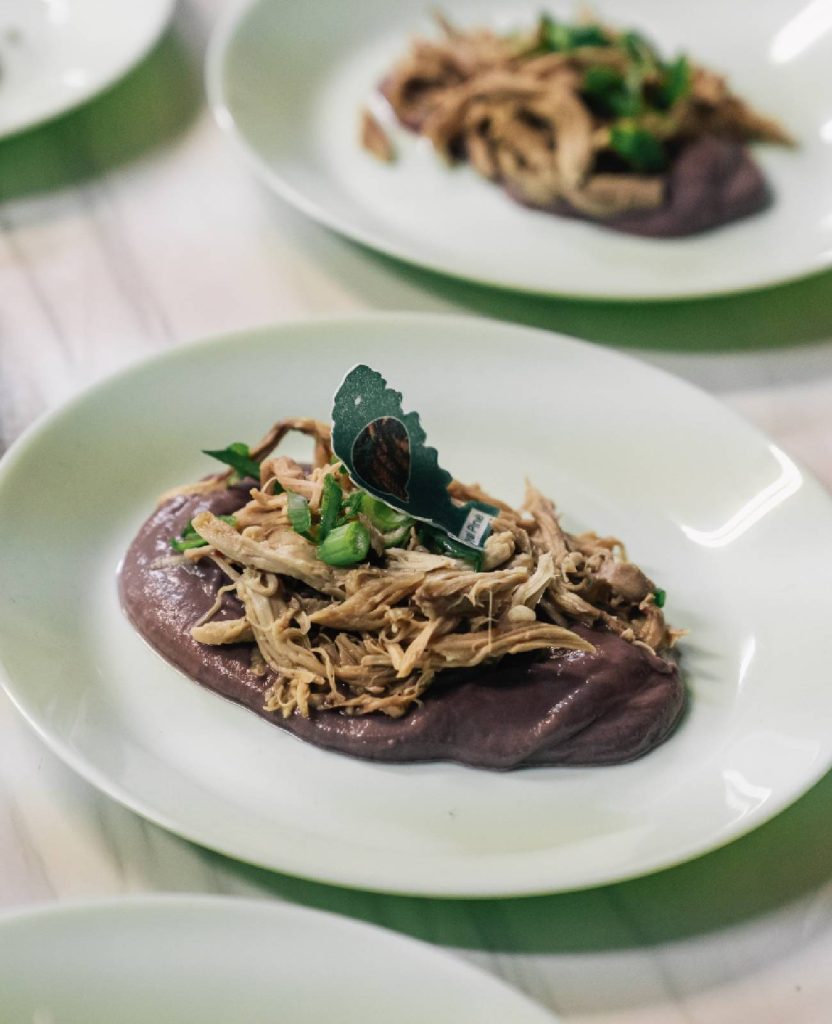 Cordero desmechado con parmentier de safernaria y chirivía, y esencia de pino y garriga.