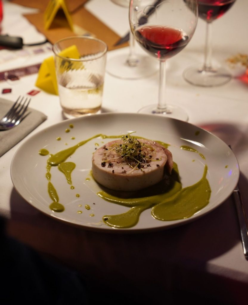 Royal de pintada, ciruelas y frutos secos con salsa densa de endivias y