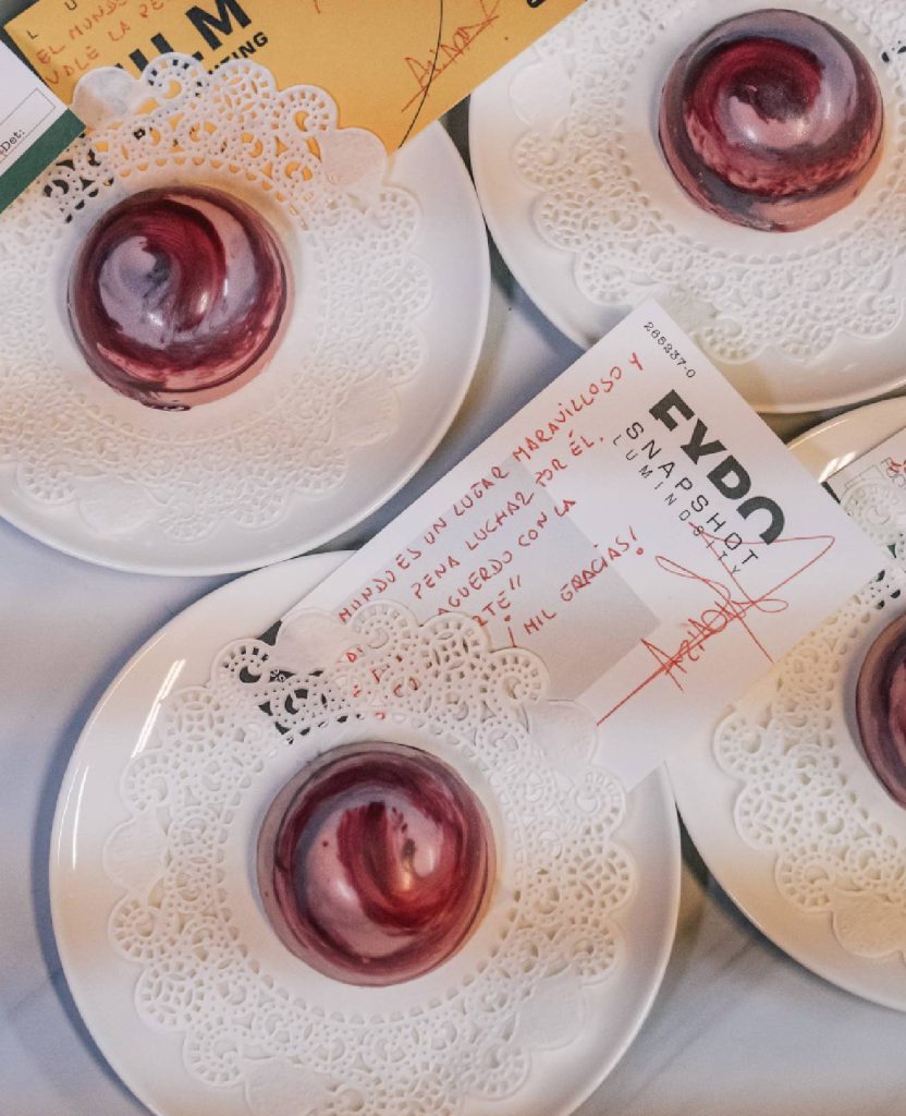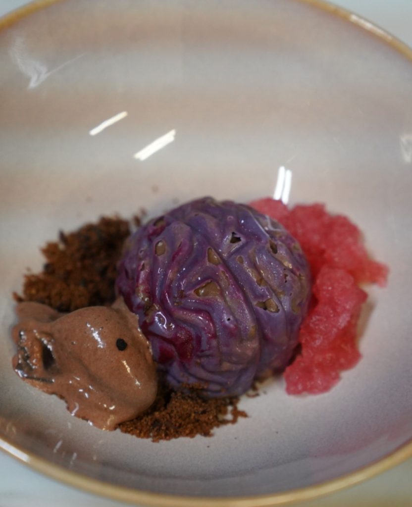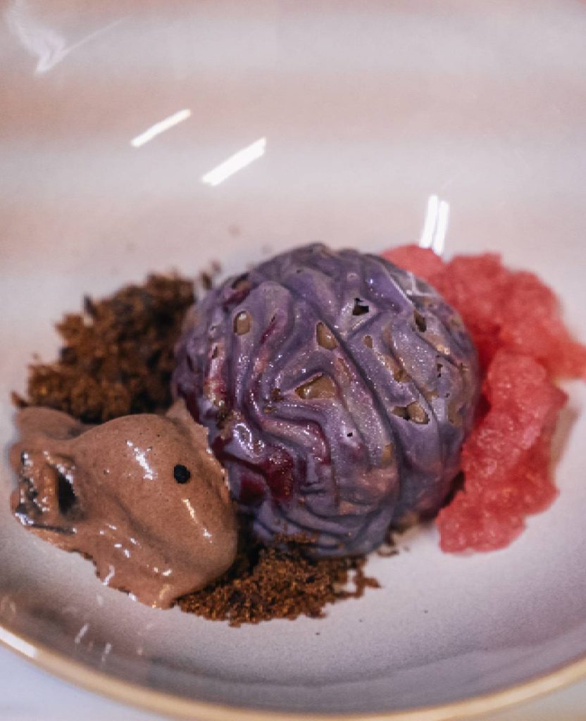 Corazón relleno de mousse de foie, cobertura de manteca de cacao roja, núcleo líquido de Oporto y frutos rojos con un toque de chile. Crumble de pan brioche de carbón activo.