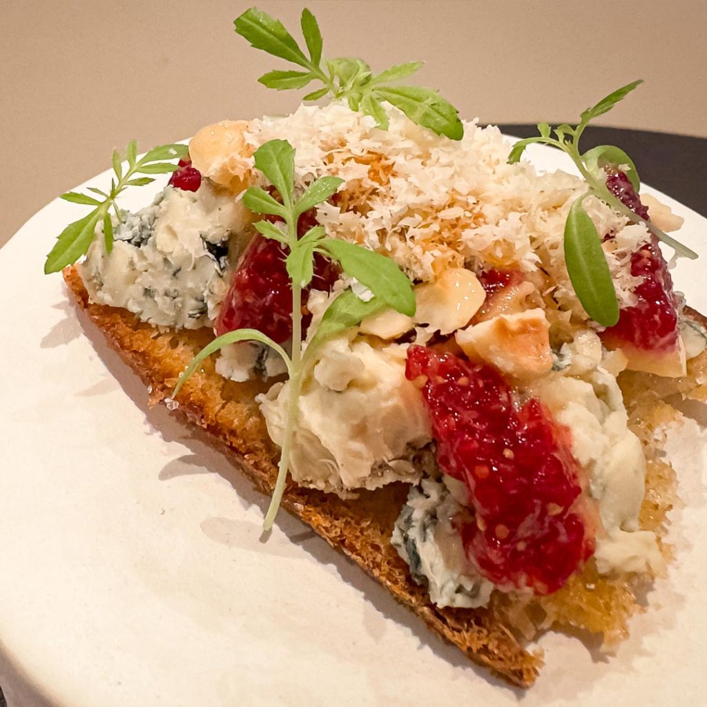 El chef de Óseo, David Morillas, se sale del guión dulce y propone un bocado salado pensado para elevar el cóctel a otro nivel. Su idea es una tosta crujiente de pan de xeixa con un queso azul de vaca, higos maduros, un hilo de miel de naranjo y avellanas tostadas troceadas. Un snack de dos o tres mordiscos que juega con los contrastes del cóctel, el dulzor del Pedro Ximénez, la acidez del limón, el amargor del bitter, y lo lleva a un terreno más goloso y equilibrado.