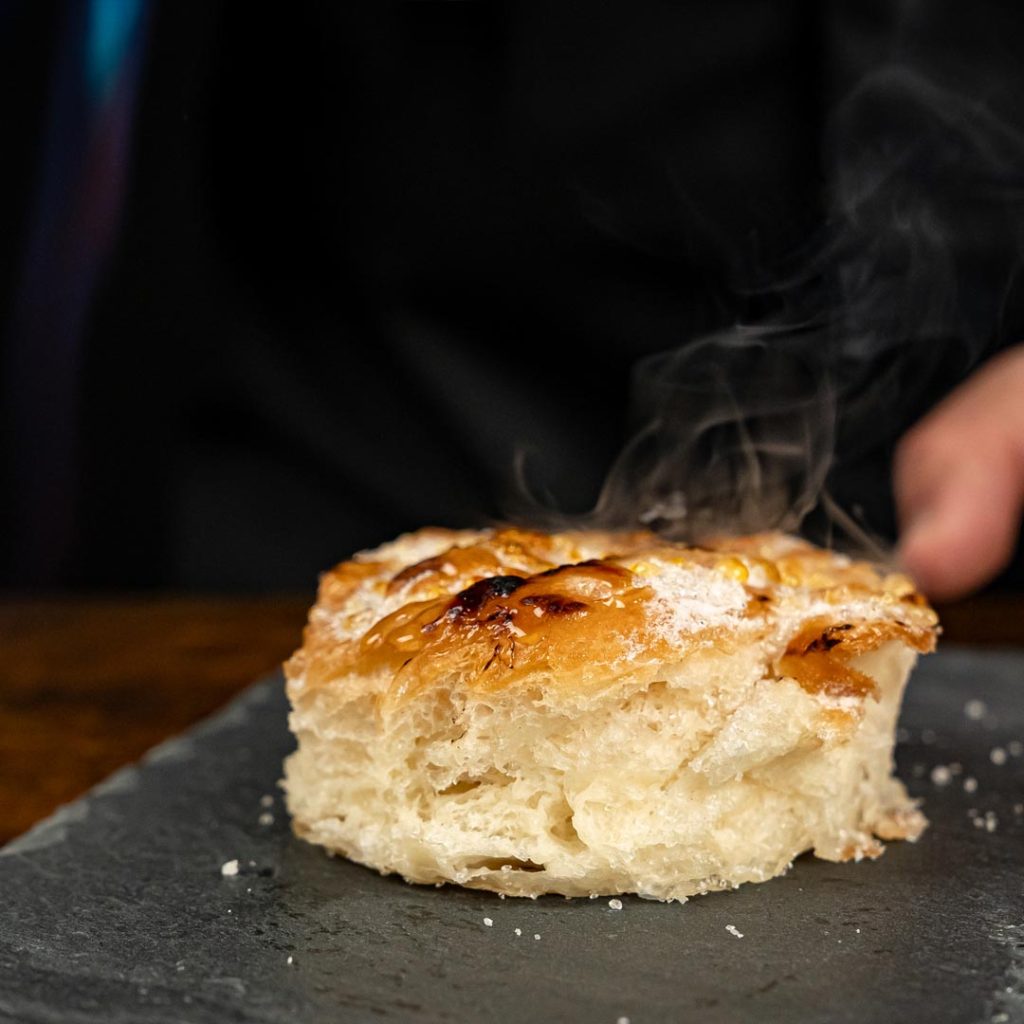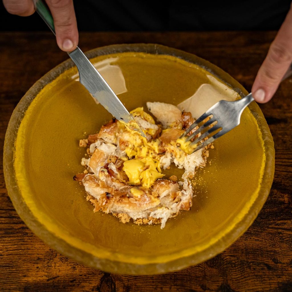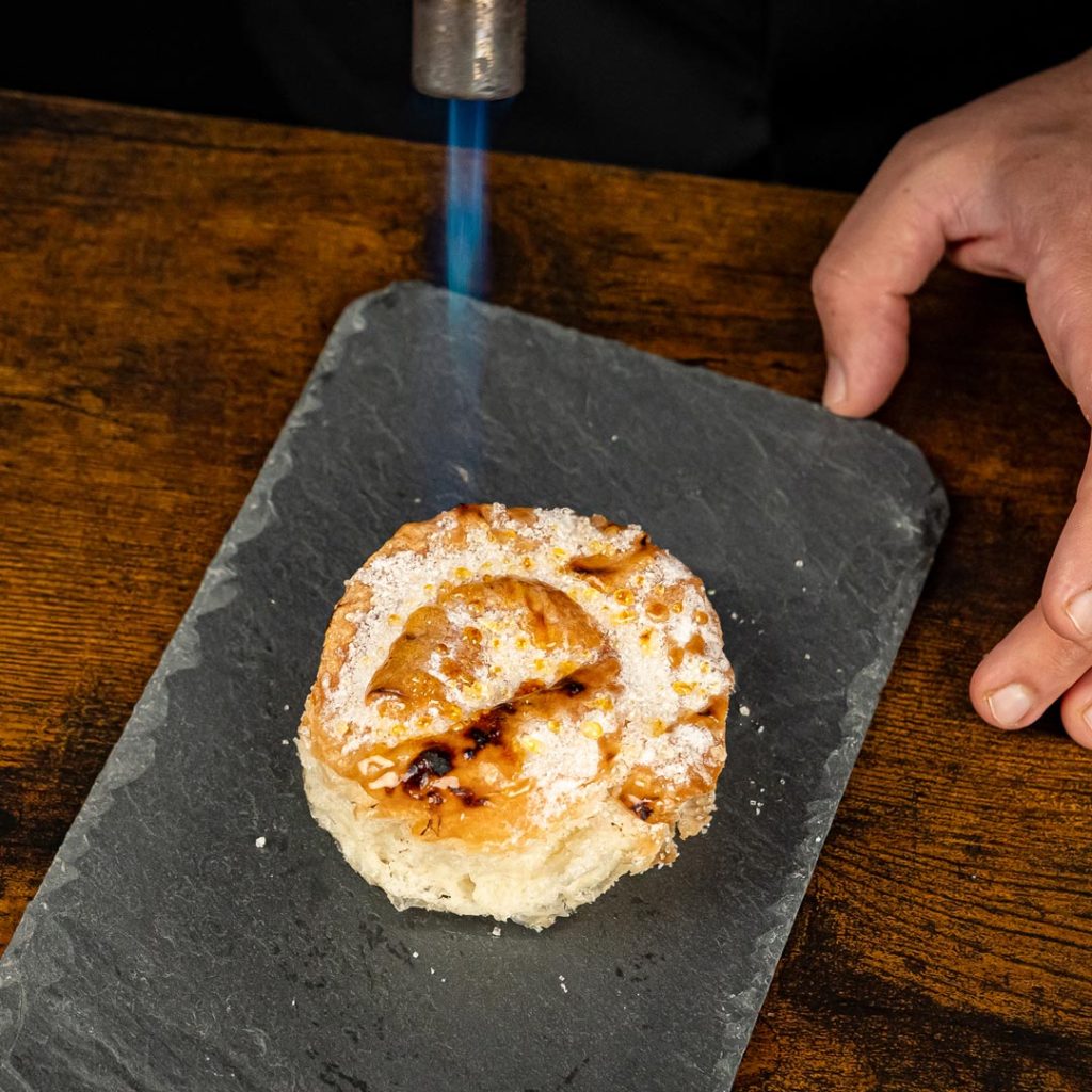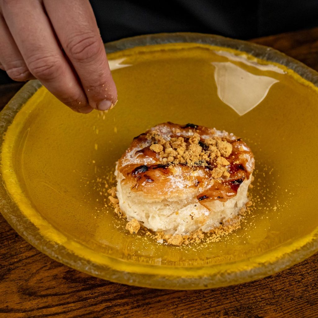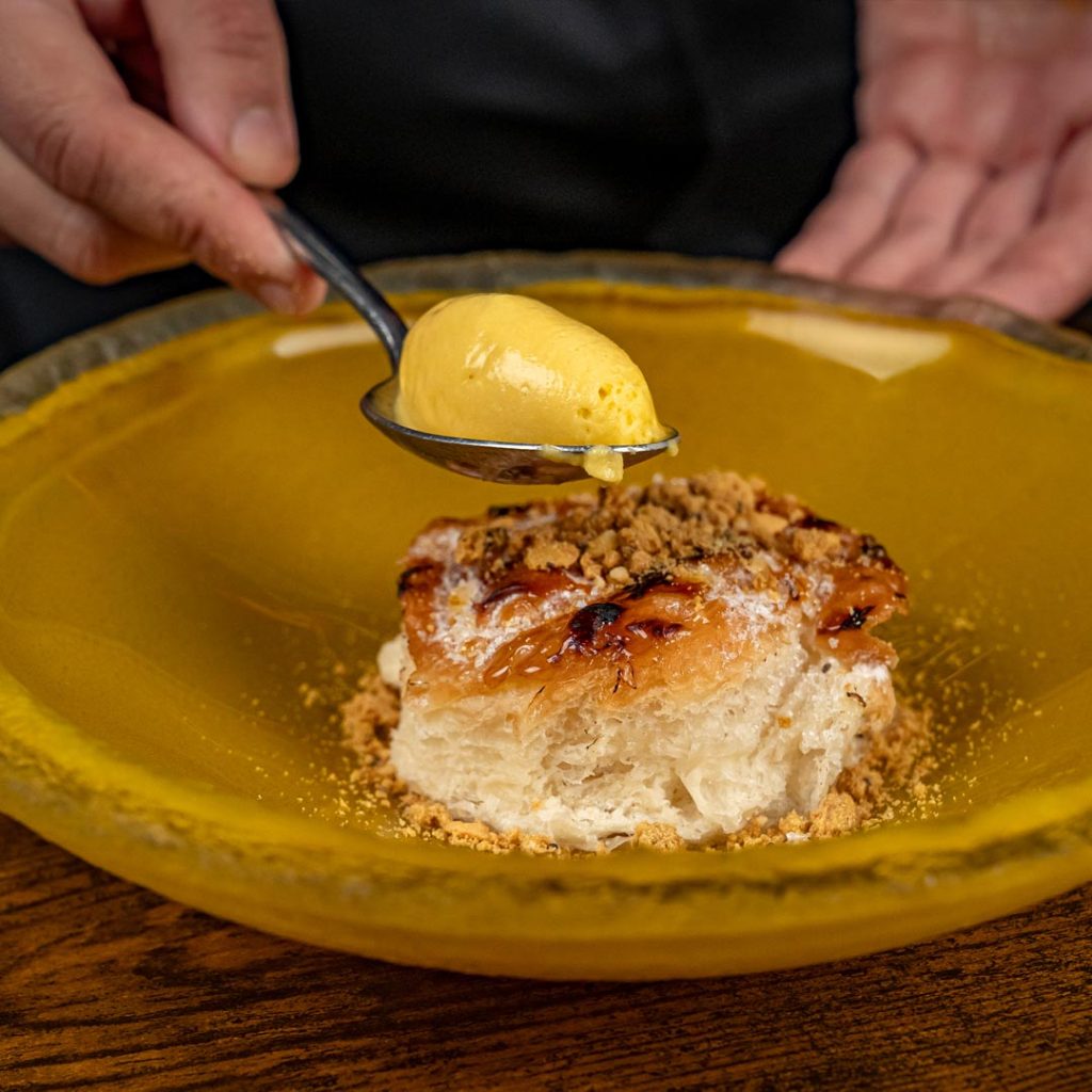El otoño huele a pan caliente, azúcar tostado y a recuerdos que vuelven. Jhonatan Maldonado, chef de Fontsanta, lo traduce en una torrija de ensaimada bañada en caramelo de Pedro Ximénez, con crumble cítrico, helado de vainilla y jengibre y una nube quemada que evoca el humo de las primera hogueras de invierno. Un postre que reconforta, como volver a casa después de los primeros fríos de otoño, invierno y Navidad.